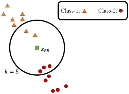 K-nearest neighbor functions as a clustering algorithm within supervised machine learning [], which performs classification based on inter-data distances without generating a neural network model. The algorithm constructs a data distribution map using the training dataset T, where yi encompasses two distinct classes represented by yellow triangles and red circles, respectively. As illustrated in Figure 3, the green square denotes the feature vector xFE to be classified, while the spatial distribution is determined by the feature characteristics of each training instance. For a user-specified k value, the algorithm identifies k nearest data points to xFE and assigns the predominant class label among these neighbors, as demonstrated by the enclosed region containing five nearest points when k = 5.