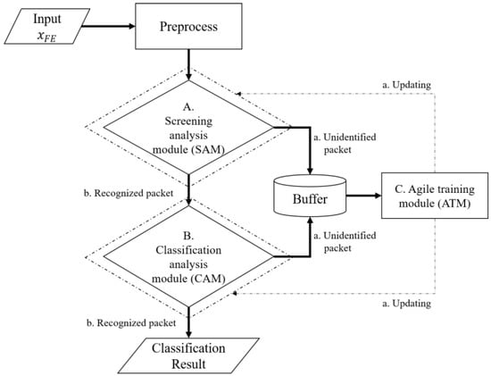 - Step 1. When the number of unid packets in the buffer reaches a th threshold, the ATM is activated. These packets are carefully selected, specifically targeting packets not included in the initial training of the SAM and CAM. From this filtered collection, th packets are randomly sampled to constitute the agile training dataset.