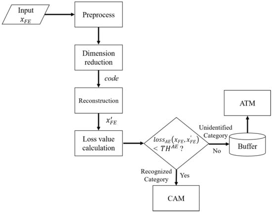 The SAM is used as a preliminary detector for checking whether the input packet is known or not, which is based on Autoencoder. First, the features of the preprocessed input xFE undergo dimension reduction via Equation (1) to acquire a low-dimension value code. Then, code is reconstructed through Equation (2) to obtain high-dimension . Later, the SAM computes the difference between xFE and via Equation (3). After that, the SAM is able to perform classification based on the threshold THAE. If is lower than THAE, the input is classified under the recognized category; otherwise, it is classified as unidentified. Furthermore, the unidentified packet is stored in the buffer for the ATM. The recognized packet is passed to the CAM. Details of the SAM are illustrated in Figure 5.