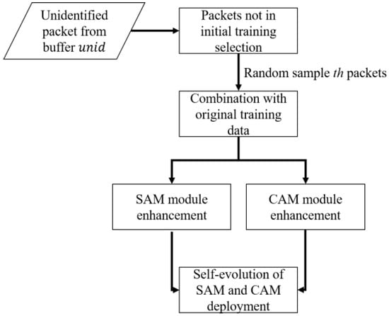 - Step 3. For CAM enhancement, both random forest and KNN models are retrained using an augmented dataset. This dataset combines the original training data with the newly selected th unidentified packets. Following the self-evolution process, the updated random forest and KNN models are integrated into the system architecture.