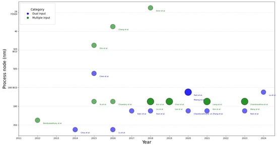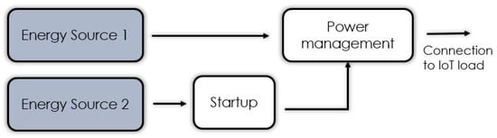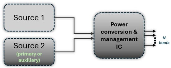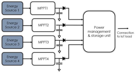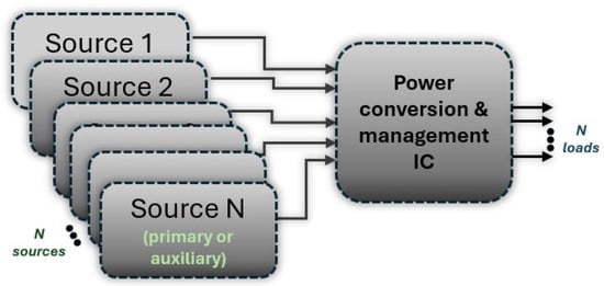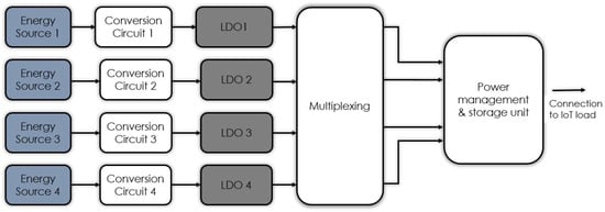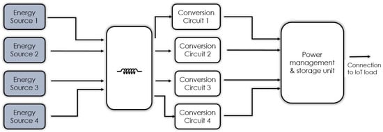 - Kim, S.; Vaidya, V.; Schaef, C.; Lines, A.; Krishnamurthy, H.; Weng, S.; Liu, X.; Kurian, D.; Karnik, T. A Single-Stage, Single-Inductor, 6-Input 9-Output Multi-Modal Energy Harvesting Power Management IC for 100 uW–120 MW Battery-Powered IoT Edge Nodes. In Proceedings of the 2018 IEEE Symposium on VLSI Circuits, Honolulu, HI, USA, 18–22 June 2018; pp. 195–196. [Google Scholar] [CrossRef]