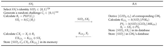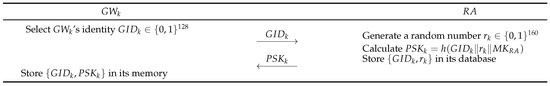 In this phase, sensor nodes and users should perform the registration process with the corresponding . The communication is assumed to be secure during this phase. The assigns secret values to and for subsequent authentication and key agreement.