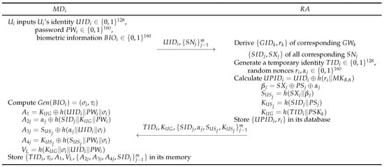 - Through the , the generates a unique identity , password , and random number . Next, computes and inputs biometric data into the . Then, composes and sends a registration request to through a secure channel.