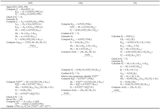 Some researchers suggested multifactor authentication to provide comprehensive security and achieve a variety of desired security goals. Kaur et al. [19] proposed an enhanced authentication scheme utilizing a fuzzy verifier as an authentication factor. For example, the expression “” increases computational complexity and makes password-guessing more difficult, where is the password and v is the fuzzy verifier. Zou et al. [20] used three factors for their authentication scheme in smart factory environments. They demonstrate the resistance of their scheme against password guessing and smart card stolen attacks by combining multiple factors, such as biometric information, a password, and a smart card. Rangwani and Om [21] suggested a four-factor mutual authentication scheme for remote healthcare monitoring. They used the transformed bit string from the iris scan, which is unique even for twins, biometric data using a fuzzy commitment scheme, a password, and the identity of the user.