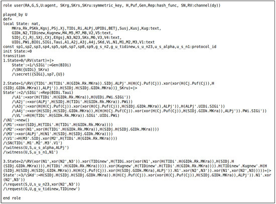 This work defines four roles for user , gateway , sensor , and registration authority , denoted by “U”, “G”, “S”, and “RA”, respectively. Then, we comprise the role specifications for the session, goal, and environment of the proposed scheme. Figure 6 presents the source code for the role of , and we will explain its role in detail as an example. In the registration and authentication phases, recognizes four agents: user (U), gateway (G), sensor (S), and registration authority (RA). “(SN, RV)” means that agents send and receive messages through a public channel channel(dy) which follows the DY model. At first, initializes the state to 0 (State = 0) and receives the start signal “RV(start)”. In the state = 1, “RV({TIDi’.H(TIDi’.H(GIDk.Rk.MKra)).SIDj.ALPj’. H(H(Cj.Puf(Cj)).xor(xor(H(Cj.Puf(Cj)),H(SIDj.GIDk.MKra)),ALPj’)). H(SIDj.H(SIDj.GIDk. MKra)))}_SKru)” indicates that the receives messages from the RA. The “SKru” ensures that the registration messages are transmitted via a secure channel. After that, sends the authentication request message to through a public channel. “SN(TIDi’.M1’.M2’.M3’.V1’)” means that sends . In the state = 3, computes a session key and authenticates completely with .
