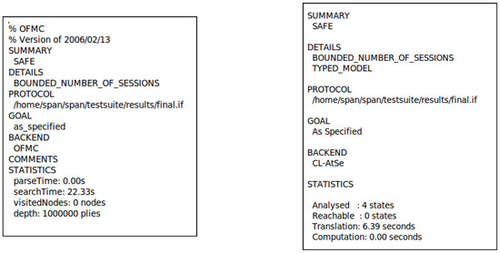 The HLPSL code is converted into “Intermediate Format (IF)” by the AVISPA simulation translator. From the IF code, the backend models generate the simulation outputs in “Output Format (OF)”, which is ‘SUMMARY’. Figure 7 shows the summaries of the proposed scheme under the OFMC and CL-AtSe backend models. In the case of OFMC, the search time is 22.33 s and the number of visited nodes is 0. In CL-AtSe, the result reveals four analyzed states and takes 6.39 s for translation. Both simulation outputs are “SAFE,” and therefore we demonstrate that the scheme prevents replay and MitM attacks.