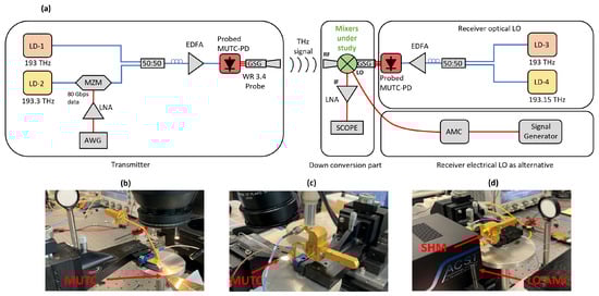 THz transmission and reception architecture. (a) shows photonic transmitter based on optical heterodyne mixing in a probed modified uni-traveling-carrier photodiode (MUTC) to generate THz signals, where data are provided by modulating one of the laser arms. After transmission in the wireless channel, the signal is down-converted to IF using a sub-harmonic mixer (SMH) pumped by two different approaches. The first case is similar to the TX, using the beating of two lasers, and the second case uses electrical pumping. (b) shows a picture of the THz transmitter consisting of the probed MUTC connected to a horn antenna pointing to the receiver. (c) shows a picture of the receiver; here, the mixer is connected to a probed MUTC, which generates the LO signal to pump the mixer. (d) shows a picture of the electrically pumped receiver, consisting of an AMC connected to the mixer.