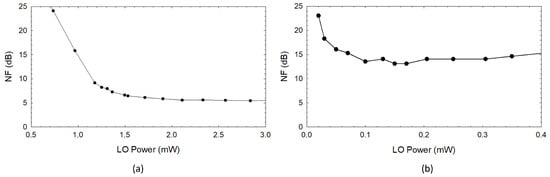 As seen in Figure 3a, the GaAs-based mixer exhibited superior performance, reaching a minimum NF of approximately 6 dB. The noise figure decreased sharply as the LO power increased, stabilizing at 1.5 mW, where it reached a plateau. Beyond this power level, the NF remained constant even at LO power levels, exceeding 3 mW. However, at LO powers below 1 mW, the NF deteriorated significantly, indicating that the mixer operates inefficiently in this regime and would not be suitable for practical applications at such low LO drive levels.