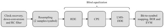 DSP block diagram used in reception. RDE is the radius-directed equalizer, CPE is the carrier phase estimation, and LMS-DDE is the least-mean-square decision-directed equalizer.