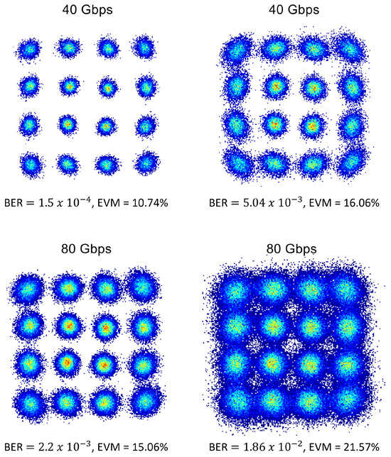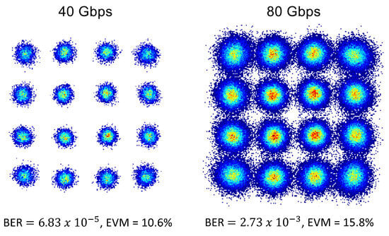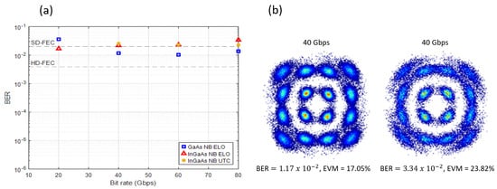 Figure 8 illustrates the constellation diagrams obtained using an InGaAs narrow-band mixer, where well-defined clusters of constellation points can be observed. The measured BER reached a value of and at data rates of 40 and 80 Gbps, respectively. This indicates that a BER below the HD-FEC limit can be also achieved with the InGaAs-based mixer as a direct consequence of using optical pumping. It is important to note that the integration of optical pumping with GaAs mixers was not possible because of their high-demand LO power requirements compared to InGaAs mixers.