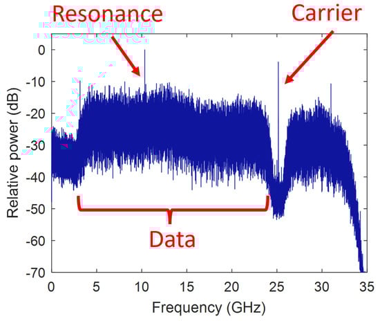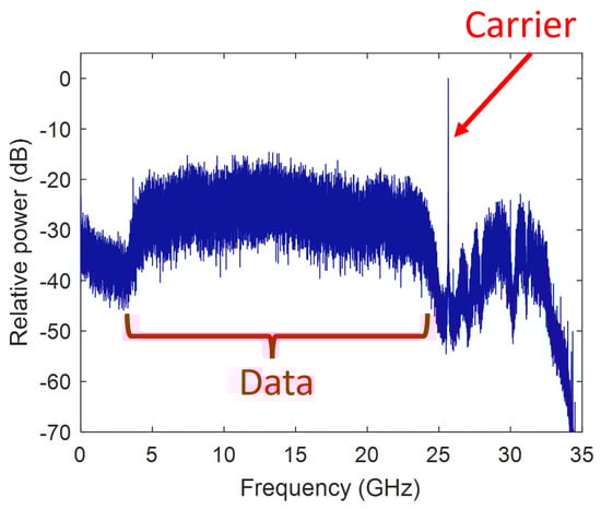 IF spectrum using optical pumping; 20 GHz of data bandwidth captured, with the carrier centered at 25 GHz. No unwanted harmonics appeared.