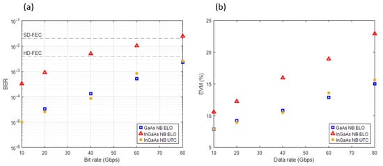 Regarding the GaAs mixer, Figure 9a,b show how the electrically pumped mixers maintained exceptionally low BER and EVM levels across the data rate while remaining below the HD-FEC threshold. Similarly, the InGaAs narrow-band optically pumped mixer demonstrated noteworthy performance and operated within the HD-FEC limits as well. According to Table 1, the InGaAs narrow-band mixers should perform worse than their GaAs counterparts due to the higher conversion loss. Nevertheless, the optically generated signals demonstrated a higher purity than electrical ones. Consequently, the purity of the LO signal compensated for the anticipated performance gap, leading to equivalent final results.