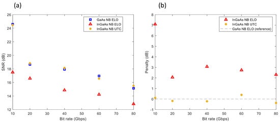 Since the obtained BER was very similar for the electrically pumped GaAs and optically pumped InGaAs mixers, the calculated SNR was consistent, with maximum and minimum values of approximately 24.5 dB and 15.5 dB for 10 Gbps and 80 Gbps, respectively. In contrast, the electrically pumped InGaAs mixer exhibited a penalty of approximately 2–3 dB in most cases, with the exception of 7 dB for 10 Gbps. It is important to note that the extracted SNR does not take into account non-linear effects or other impairments that contribute to degrading the BER. Therefore, this figure of merit serves as a simple tool to compare the mixers from a system point of view.