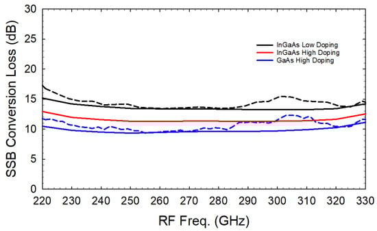 Simulated conversion loss (straight line) of GaAs mixers using highly doped epitaxy versus InGaAs mixers using high- and low-doped epitaxies and experimental measured results (dotted line) of the high-doped GaAs and low-doped InGaAs. In the current study, we used the low-doped InGaAs and high-doped GaAs.