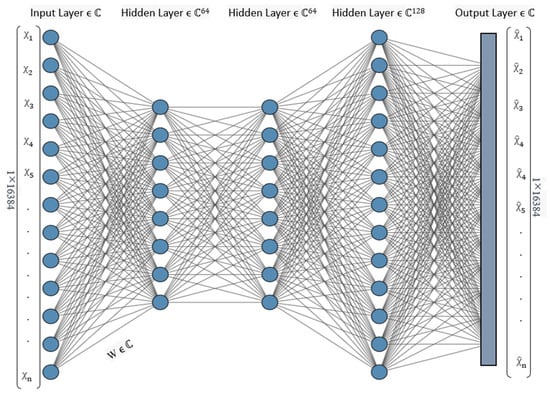 The CV-MLP model consists of a sequential neural network architecture incorporating multiple layers. The process begins with a layer, which accepts an input of dimensions 128 × 128 pixels and transforms it into a one-dimensional array with a size of 16,384. The flattened representation is subsequently fed into a sequence of layers. The initial three layers are configured with 64 units each, using activation function. This activation function involves the application of a rectified linear unit (ReLU) activation function to both the real and imaginary components of the complex numbers independently. The last-layer consists of 128 units. The dimensions of the output layer are equivalent to the flattened input, which consists of 16,384 units. The model is compiled using the Mean Squared Error (MSE) loss function and the Adam optimizer. The model possesses 6,349,312 trainable parameters and has been specifically performed to perform a regression task on complex data. The architecture of CV-MLP is illustrated in Figure 2.