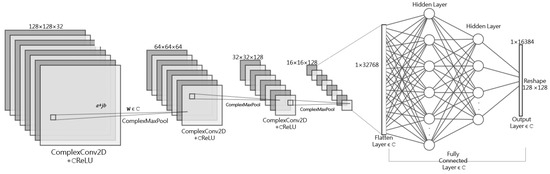 The architecture of the complex-valued convolutional neural network (CV-CNN) is depicted in Figure 3. The fundamental architecture resembles CNNs designed for regression tasks involving real-valued data [25]. The present model is a deep neural network explicitly engineered to process complex data. The architecture comprises an initial input layer, succeeded by three encoder blocks. Each encoder block comprises a convolutional layer with complex-valued weights and a max pooling layer that operates on complex values. The convolutional layers have 32, 64, and 128 filters, respectively, utilizing a 3 × 3 kernel and employing activation function. Following encoding, a flattened layer converts the data into a 1 vector. After the flattened layer, there are three fully connected layers of 256, 128, and 128 units, respectively. The initial two fully connected neural network layers employ the activation function. In contrast, the final layer, responsible for generating regression predictions, does not utilize any nonlinear activation function. Consequently, the output of the model is a straightforward linear combination of the input features or the output of the previous layer. Finally, the network reshapes the output vector to yield reconstructed images with a dimension of pixels.