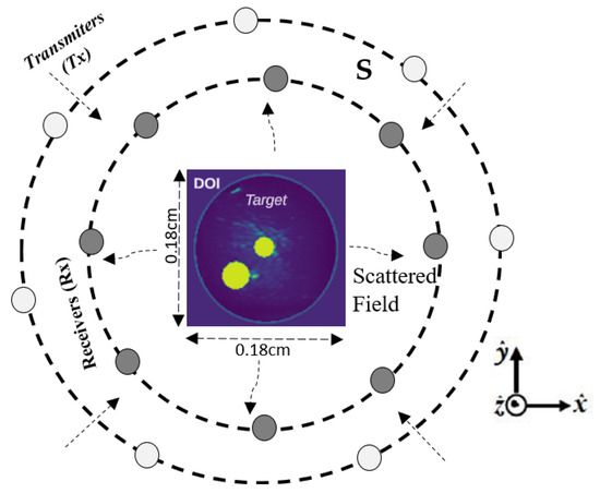 The measurement setup illustrated in Figure 1 represents a 2-D Transverse Magnetic (TM) measurement configuration. The area of focus, commonly known as the Domain of Interest (DOI), is the specific location where our object of interest () is located. The is subjected to a series of incident waves (), denoted as . Here, n denotes the index of nth illumination, while N represents the total number of transmitters or line sources. For each illumination event, a collection of M receivers is uniformly distributed throughout the observation domain S. The receivers play a vital role in capturing the scattered electric fields produced by the target. The integral equation of the electric field can describe the total field in and the scattered field in the domain S. These fields can be represented using a discretized form as follows: