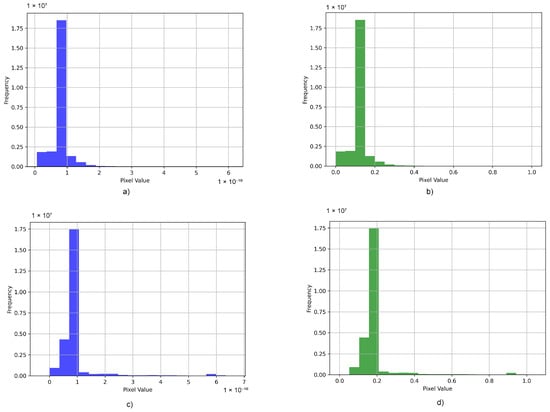 Data normalization: (a) histogram of non-normalized data for network input, (b) histogram of normalized data for network input, (c) histogram of non-normalized data for network output (ground Truth), and (d) histogram of normalized data for network output (ground Truth).