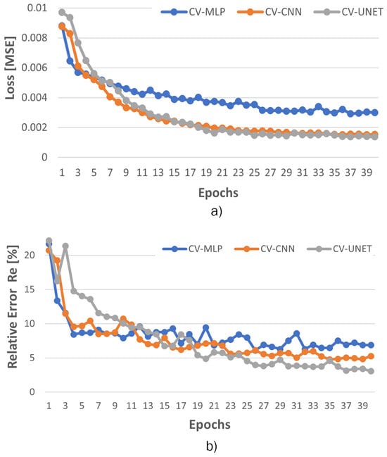 In order to assess the impact of optimization strategies on model performance, we performed a series of experiments using two widely adopted optimizers, Adam and Stochastic Gradient Descent (SGD), with learning rates of 0.001 and 0.01. Table 4 presents the relative error validation and loss (MSE) obtained for each model in these configurations. The results indicate that the Adam optimizer with a learning rate of 0.001 consistently outperforms other settings across all architectures (CV-MLP, CV-CNN, and CV-UNET), yielding lower reconstruction error and improved convergence. In contrast, the performance of SGD, particularly at lower learning rates, was less stable and led to significantly higher errors in some cases. These findings support the use of Adam (0.001) as a robust and reliable choice for training the proposed models.
