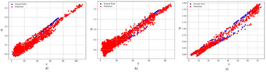 Figure 8 presents an illustrative demonstration of prediction utilizing our proposed CVNNs models. These models employ complex-valued neurons and their output is visually represented by 2-D Cartesian diagrams. After performing validation, it becomes evident that CV-UNET demonstrates outstanding performance as its predictions align with the actual ranges for (2.5–67) and (0–1.8). In contrast, CV-CNN encounters difficulties in this aspect as its results are above the true thresholds for and . Finally, the CV-MLP model demonstrates the least desirable fit level as its predictions deviate significantly from the true values, surpassing 100 for and approaching 3 for .
