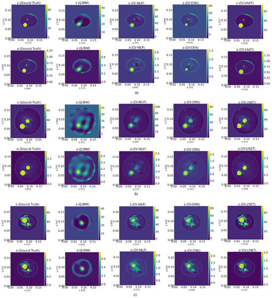 Reconstruction of the dielectric profiles of the breast models using the quadratic BIM followed by three types of CVNNs proposed: CV-MLP, CV-CNN, and CV-UNET. (a) Representative model from Class 1, (b) representative model from Class 2, and (c) representative model from Class 3.