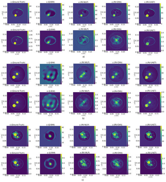 Reconstruction of the dielectric profiles of the breast models using the quadratic BIM followed by three types of RVNNs: RV-MLP, RV-CNN, and RV-UNET. (a) Representative model from Class 1, (b) representative model from Class 2, and (c) representative model from Class 3.