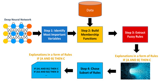 The main steps of the explainability method that we developed are shown in Figure 1. We start with an AI model (e.g., shallow neural network, deep neural network, support vector machine, deep reinforcement learning network) that was trained to provide a decision or a prediction. For the ease of description, let us assume that the decision is a classification into one of n classes, but in reality, the decision/prediction could be of a different type. The first step is to determine from the large number of input features (sometimes thousands of them) the top k features that are the most important. In the second step, for each of the k features, a set of FMFs will be built. In the third step, fuzzy rules will be extracted for those features and the corresponding membership functions. These fuzzy rules are the explanations of why a given instance is classified into a given class (as such, they are local explanations). The full set of rules is a global explanation, explaining the behavior of the AI model. Often the full set of rules is not necessary, and a small subset of rules can be chosen that explains the model behavior. The fourth step of FuzRED is to choose that small subset of rules that explain the behavior of the AI model.