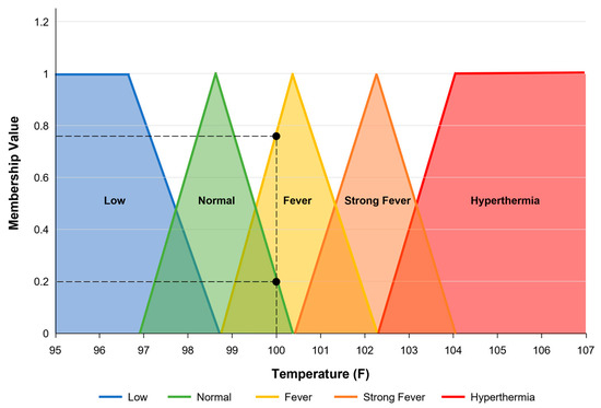 - The rule states that a patient exhibiting a strong fever, yellowish skin, and a profound loss of appetite is likely suffering from acute hepatitis. “Strong Fever”, “Yellowish”, “Profound”, and “Acute” are membership functions of the variables Temperature, Skin, Loss of appetite, and Hepatitis, respectively. To illustrate this, consider the FMFs for the variable Temperature given in Figure 2. According to the definition in that figure, a person with a body temperature of 100 °F has a “Normal” temperature with a membership value of 0.2 and, simultaneously, has a “Fever” with a membership value of 0.78. These FMFs provide a nuanced way to interpret data, reflecting the complexity of real-world situations. More information on fuzzy logic and fuzzy membership functions can be found in [11].