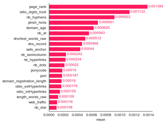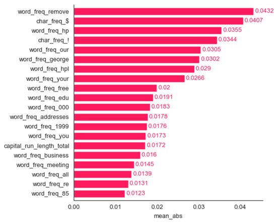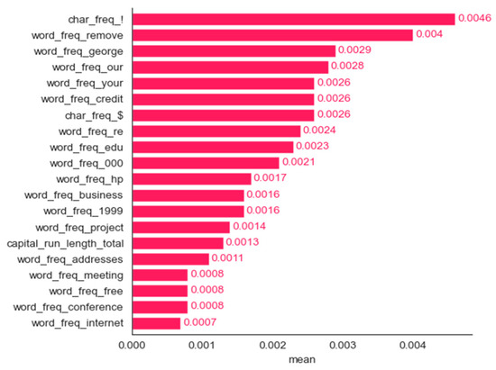 Spam dataset: bar plot for the top 20 features determined using the mean contribution method.