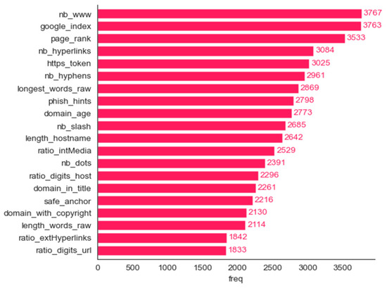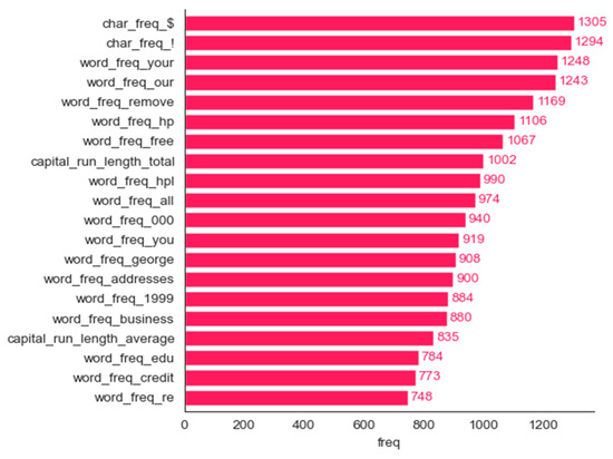 Spam dataset: bar plot for the top 20 features determined using the frequency method.