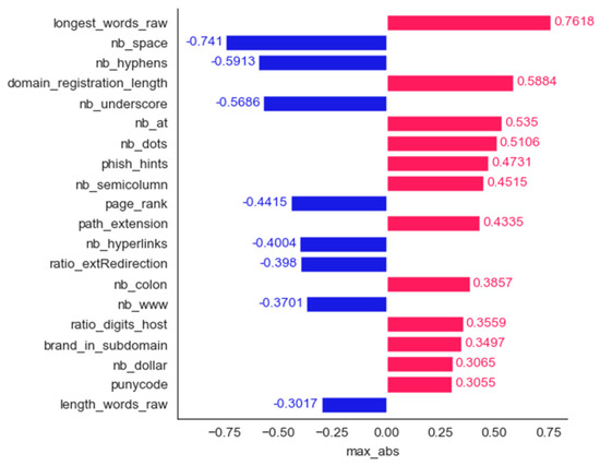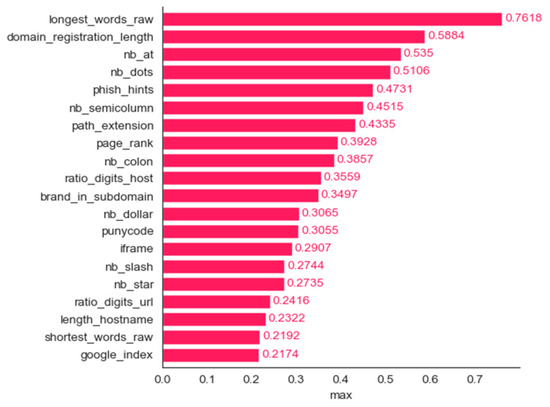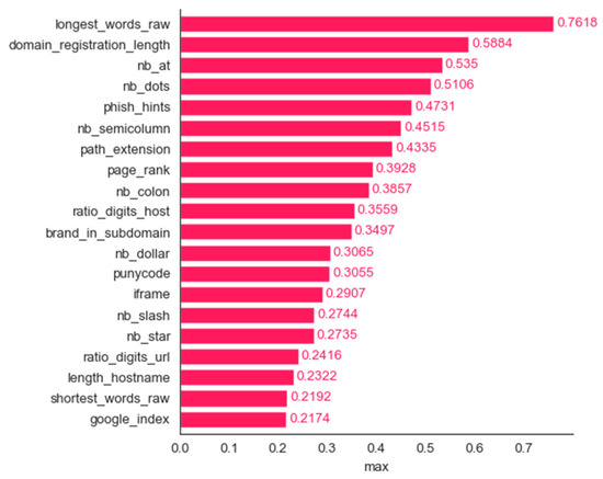 Spam dataset: bar plot for the top 20 features determined using the maximum contribution method.