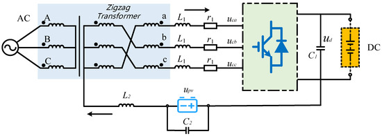 In Figure 1, L1 is the equivalent inductance on the grid side of the three-phase inverter, and r1 is the equivalent resistance. The three-phase full-bridge inverter part contains six IGBTs; C1 and C2 are DC port filter capacitors; upv is photovoltaic DC voltage; ud is DC voltage; L2 is the neutral DC filter inductor. The AC end is the three-phase power grid port, and the DC end is the inverter DC port.