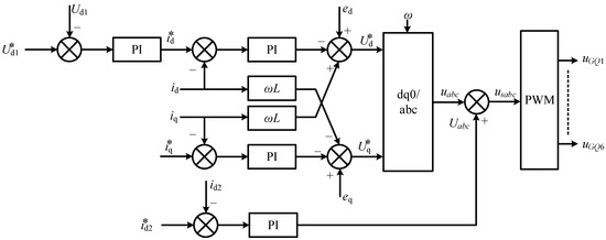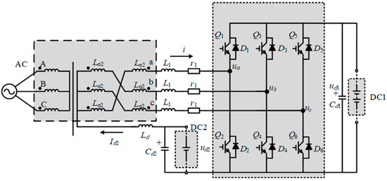 The simplified schematic diagram of the AC/DC power loop is shown in Figure 3, where e is the AC voltage converted from the grid to the secondary side, i is the AC component of the current flowing to the inverter and u is the AC component of the voltage at the AC port of the inverter. The AC loop equation in the rotating coordinate system can be expressed as Equation (1):