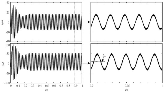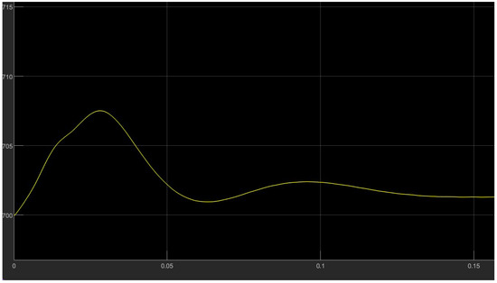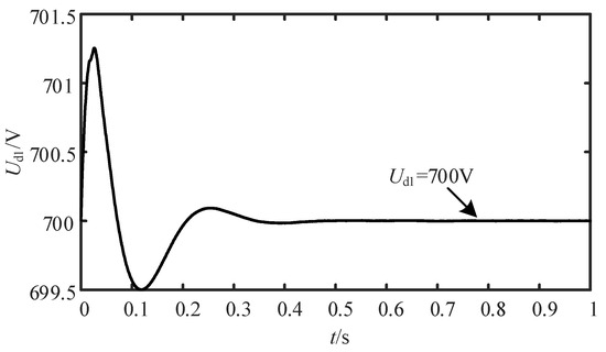 Under the overall operation of the converter, as shown in Figure 8, the voltage of the current on the DC side is stabilized at 700 V after a transient process for a certain time. In Figure 9, when the system responds to sudden voltage surge, it can quickly stabilize to the reference value after 0.1 S. It can be seen that the DC voltage of the topology is stable, and the function of stable three-port power flow can be realized. As shown in Figure 10, under the overall operation, the primary current and secondary current stabilize after a certain period of time; the primary current stabilizes at 10.4 A, the effective value of the secondary current stabilizes at 38 A and there is obvious DC bias current ILa (value 7 A), which is mainly DC current in the same direction, indicating that the winding can pass the DC current input from the DC auxiliary port. Moreover, the positive sequence three-phase current of the AC circuit is suppressed, and the effect of the iron core winding on the AC current component in the AC circuit is verified. There are no harmonics and bias in the primary-side current, which indicates that there is no DC magnetic flux in the core and verifies the effect of the zigzag connection method on inhibiting the DC magnetic flux in the core.