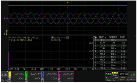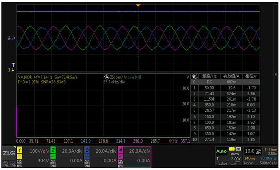 According to the optimized control strategy, when the output active power is about 10 kW, the current waveform is shown in Figure 12. At this time, THD can be as low as 2.93%. “频率” means Frequency, ”有效值” means Effective value ”相位” means phase.