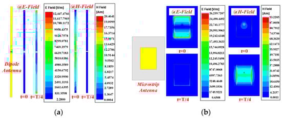 Evidently, the distributions of the E- and H-fields exhibit a phase shift of π/2, equivalent to a quarter-period, both temporally and spatially. Taking the classic dipole antenna shown in Figure 1a and the classic microstrip antenna shown in Figure 1b as examples, their near-field distribution characteristics fully align with this analysis. In conclusion, within the near-field domain of standing-wave antennas, the E- and H-fields occupy distinct spatial distributions. Therefore, this communication posits that when ferrite materials are incorporated into standing-wave antenna structures for miniaturization purposes, their high εr solely influences regions of concentrated E-fields. Conversely, within H-field-dominated zones, the high εr is not effective and thus does not alter an antenna’s operational performance. Similarly, the high µr of ferrites exerts its influence exclusively in regions of intense H-fields, while remaining ineffective when in E-field-dominant areas.