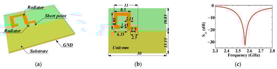 In order to verify the proposed method, as shown in Figure 2a, an end-bended single-band inverted-F antenna was employed for further analysis. The εr of the substrate is 4.4, with a loss tangent of 0.02. The size of the substrate is 30 mm × 24 mm × 0.8 mm, and the specific dimensions of the antenna structure are shown in Figure 2b. As shown in Figure 2c, the simulated impedance bandwidth (S11 ≤ −10 dB) of the base antenna is 2510–2610 MHz. Clearly, as shown in Figure 3, the dominant regions of the E-field and H-field in the antenna’s near-field domain are entirely distinct.