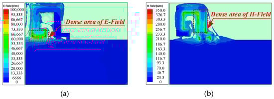 Simulated (a) dense area of E-field and (b) H-field of the antenna for the experiment.