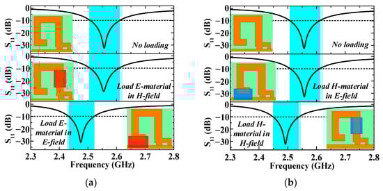 Simulated S11 of the antenna loaded (a) E-material and (b) H-material.