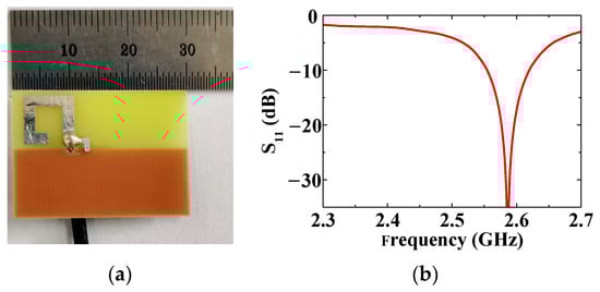 As shown in Figure 5a, an antenna prototype was fabricated for the experiment. The measured S11 of the prototype is depicted in Figure 5b. The measured results indicate that the antenna can operate within the frequency range of 2555–2620 MHz with S11 < −10 dB.
