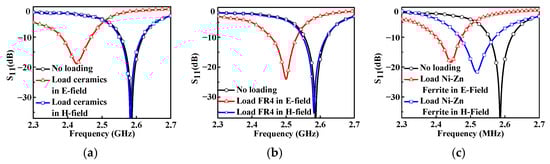 Measured S11 of antenna load: (a) dielectric ceramics, (b) FR4, and (c) Ni-Zn ferrite in the E/H-fields.