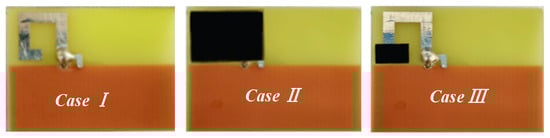 Furthermore, taking this Ni-Zn ferrite as an example, we conducted a further miniaturization design of the antenna. According to the electromagnetic parameters of this ferrite, its magnetic loss is relatively high, while the electric loss is relatively low. Therefore, based on the loading strategy proposed in this paper, this ferrite material is suitable for being loaded into the E-field-concentrated area in the near-field of the antenna to achieve the miniaturization design, rather than being loaded into the H-field-concentrated area, so as to avoid bringing significant losses to the antenna. Therefore, as shown in Figure 8, we loaded the ferrite in different ways for comparative experiments and analyses. Case II is the traditional loading method that does not distinguish the near-field distribution of the antenna, while case III is the loading in the E-field-concentrated region, determined according to the characteristics of the ferrite and the near-field distribution of the antenna. In case II, the loaded ferrite has dimensions of 12.2 × 7.4 × 0.18 mm3, while in case III, the loaded ferrite has dimensions of 6 × 3.5 × 0.24 mm3.