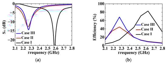 As shown in Figure 9a, in case II, the high εr and high µr of the ferrite can be effectively utilized to achieve antenna miniaturization, reducing the antenna’s operating frequency band from 2555–2620 MHz to 2230–2289 MHz. In case III, adjusting ferrite’s loading size and thickness can also achieve a similar miniaturization effect, reducing the antenna’s operating frequency band from 2555–2620 MHz to 2239–2293 MHz.