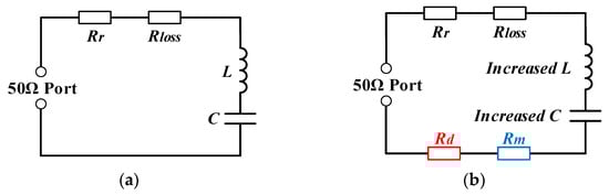 The equivalent circuit diagram of the antenna is shown in Figure 10a, where C denotes the equivalent capacitance, L denotes the equivalent inductance, Rr denotes the equivalent radiation resistance, and Rloss denotes the equivalent loss resistance of the antenna. According to the definitions of capacitance and inductance, the E-field-concentrated region of the antenna corresponds to the C, while the H-field-concentrated region corresponds to the inductance L. As shown in Figure 11, when ferrite is loaded into the E-field-concentrated and H-field-concentrated regions of the antenna, respectively, the E-fields and H-fields penetrate the ferrite. Based on the definitions of capacitance and inductance, the high εr and µr of the ferrite will increase the equivalent C and the equivalent L. Moreover, it will introduce additional dielectric loss Rd and magnetic loss Rm to the antenna, resulting in the equivalent circuit diagram of the antenna shown in Figure 10b.
