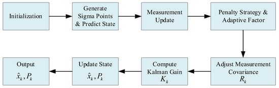 To better understand the logic and procedural flow of the proposed algorithm, Figure 1 provides a graphical illustration of the RCKF_CS steps, integrating the adaptive penalty strategy into the robust filtering framework.