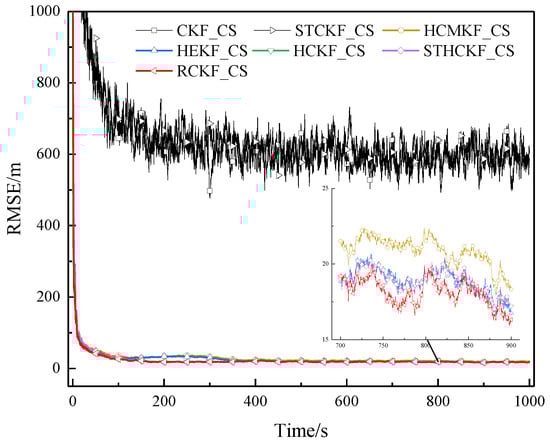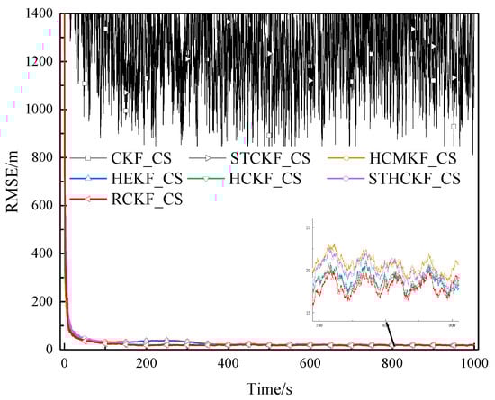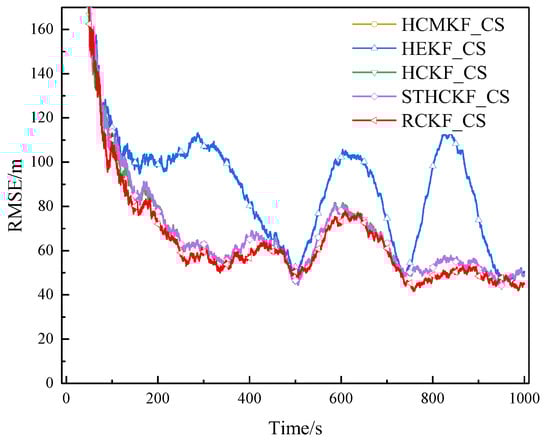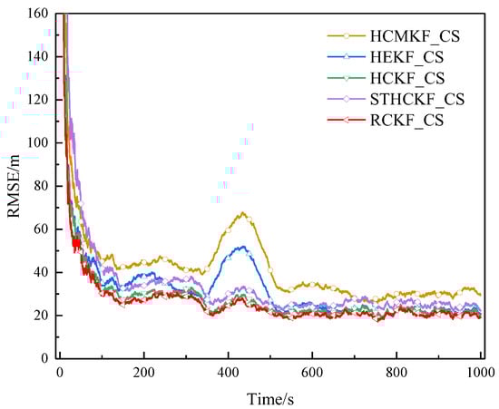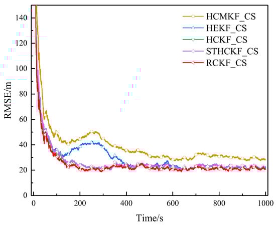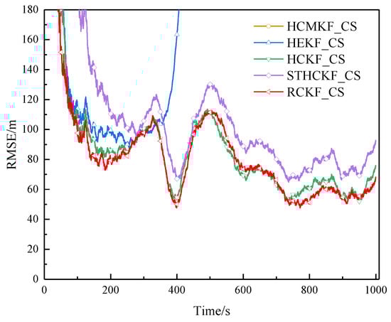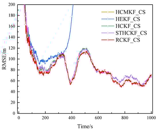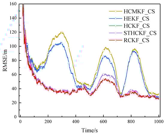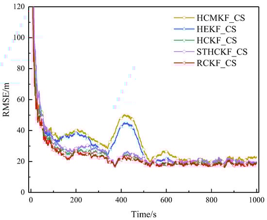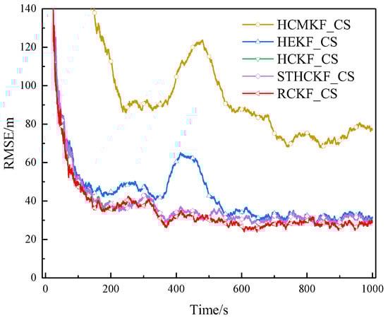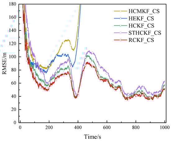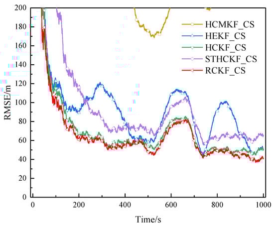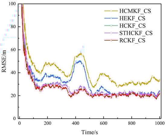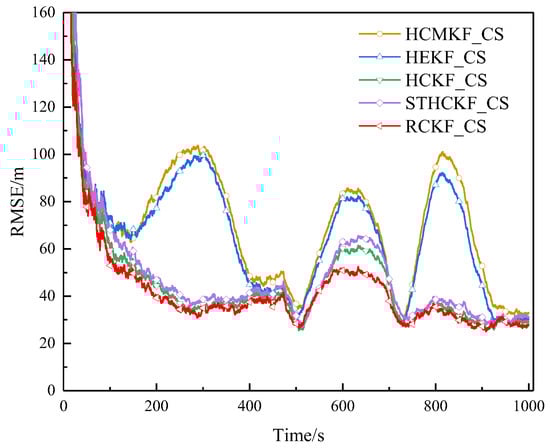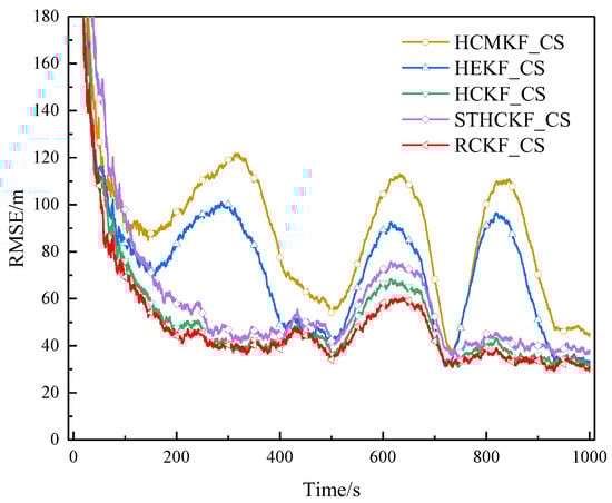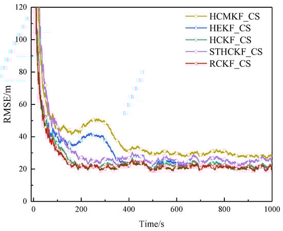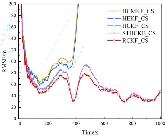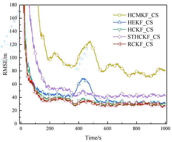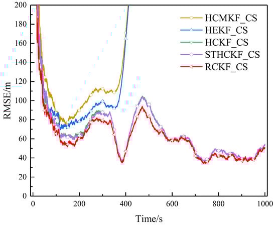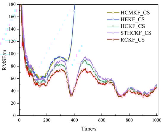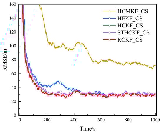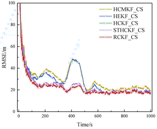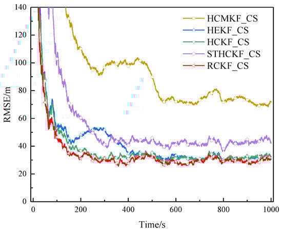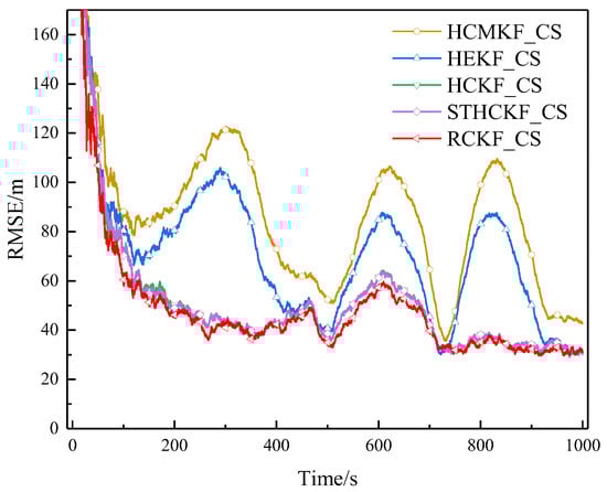 - In light of Figure 6, Figure 7, Figure 8, Figure 9, Figure 10, Figure 11, Figure 12, Figure 13, Figure 14, Figure 15, Figure 16 and Figure 17 and Table 6, Table 7, Table 8 and Table 9, the superiority of RCKF_CS to HCKF_ CS or STHCKF_CS is generally evident under any pollution rate for the same track. Furthermore, in comparison to the RCKF_CS, the RMSE of the HCKF_CS or STHCKF_CS clearly increases as the target manoeuvring from track 1~4 gradually increases at the same pollution rate. Similarly, as observed from Figure 22, Figure 23, Figure 24, Figure 25, Figure 26, Figure 27, Figure 28, Figure 29, Figure 30, Figure 31, Figure 32 and Figure 33 and Table 10, Table 11, Table 12 and Table 13, the above analyses still hold if the pollution distribution of glint noise is a Laplacian distribution. Therefore, it is shown that RCKF_CS demonstrates better adaptability for manoeuvring target tracking under glint noise than the two Huber-based approaches.