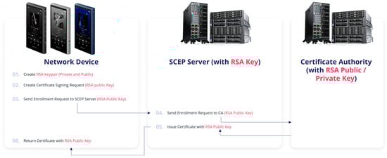 Using current technologies, cryptographic algorithms like the RSA and ECC are considered secure against brute-force attacks when the key lengths are sufficiently large. This is because classical computers would require an impractical amount of time to factor large prime numbers (in the case of the RSA) or to solve the elliptic curve discrete logarithm problem (for the ECC), making these tasks computationally infeasible. However, the advent of quantum computers fundamentally changes this security landscape. Quantum algorithms, particularly Shor’s algorithm, can efficiently solve these mathematical problems in polynomial time, effectively rendering the RSA and ECC insecure regardless of the key length when faced with a sufficiently powerful quantum computer. This vulnerability directly impacts the security of certificate enrollment protocols—such as the SCEP, EST, and others—that rely on these algorithms for authentication and secure key exchange. Devices that employ these protocols, including IoT devices, become susceptible to quantum attacks, potentially leading to unauthorized access, compromised data integrity, and the undermining of secure communications across networks [,,,,]. A typical SCEP enrollment without using PQ algorithms is depicted in Figure 1.