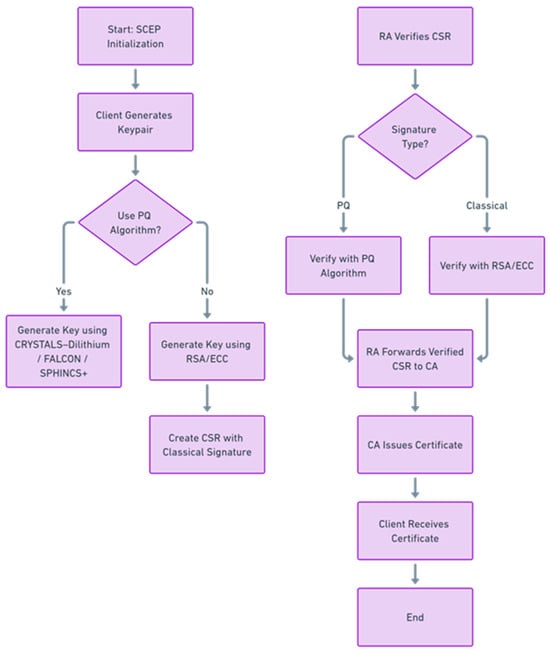 - The SCEP process starts with the client generating a keypair, choosing between classical (RSA/ECC) or post-quantum (e.g., Dilithium, Falcon, SPHINCS+).