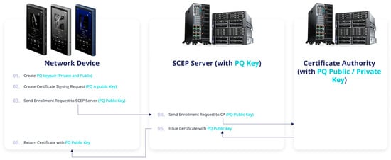 The process via which devices, such as network appliances, servers, or Internet of Things (IoT) devices, obtain and install digital certificates is known as device enrollment in public key infrastructure (PKI). These certificates are essential for providing identity authentication, data integrity, and secure communications. There is a noticeable lack of research regarding how these systems would withstand quantum assaults, despite PKI’s crucial role in protecting device enrollment and communications []. To be more precise, the research gap consists of the following: