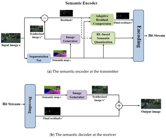 At the transmitter, the semantic map of the image is initially extracted using a semantic segmentation network. This network processes the input image and assigns a semantic label to each pixel. Next, we obtain the residual information using an image generator. This network reconstructs the image based on the extracted semantic map, and the residual information is calculated as the discrepancy between the original and the generated image.